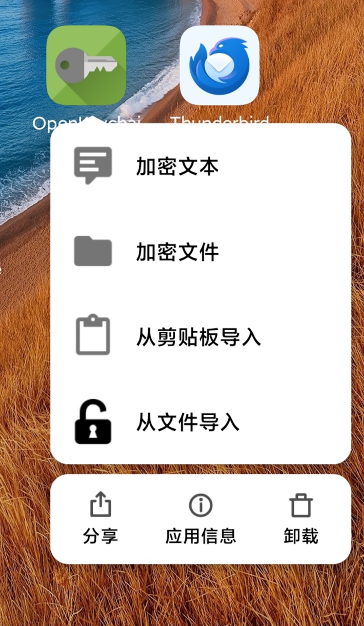 发布于2025 年 10 月 30 日 由xuenhuaOpenKeyChain 二次开发新增功能 1. 项目地址 项目地址 apk下载地址 2. 新增功能 2.1 增加解密快捷方式 2.2 文本加密新增二维码分享和保存 2.3 新增扫描二维码解密 2.4 新增在其他应用中分享到解密