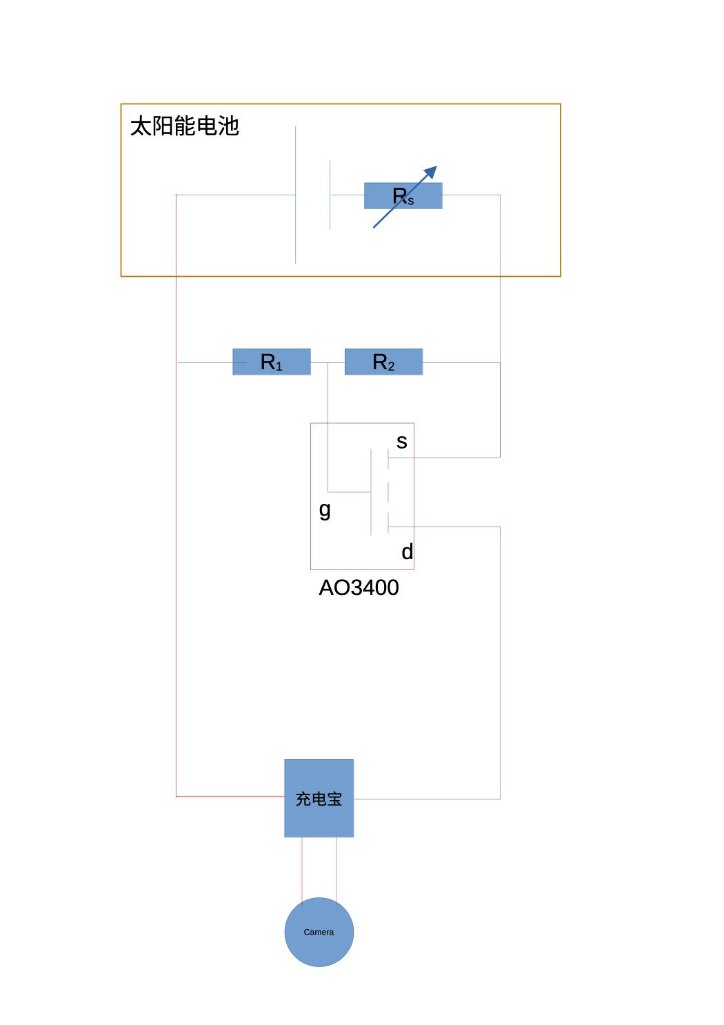 检测太阳能输出电压,当电压过低不足以给充电宝充电时,断开太阳能充电。电路尽可能简单、发热小。